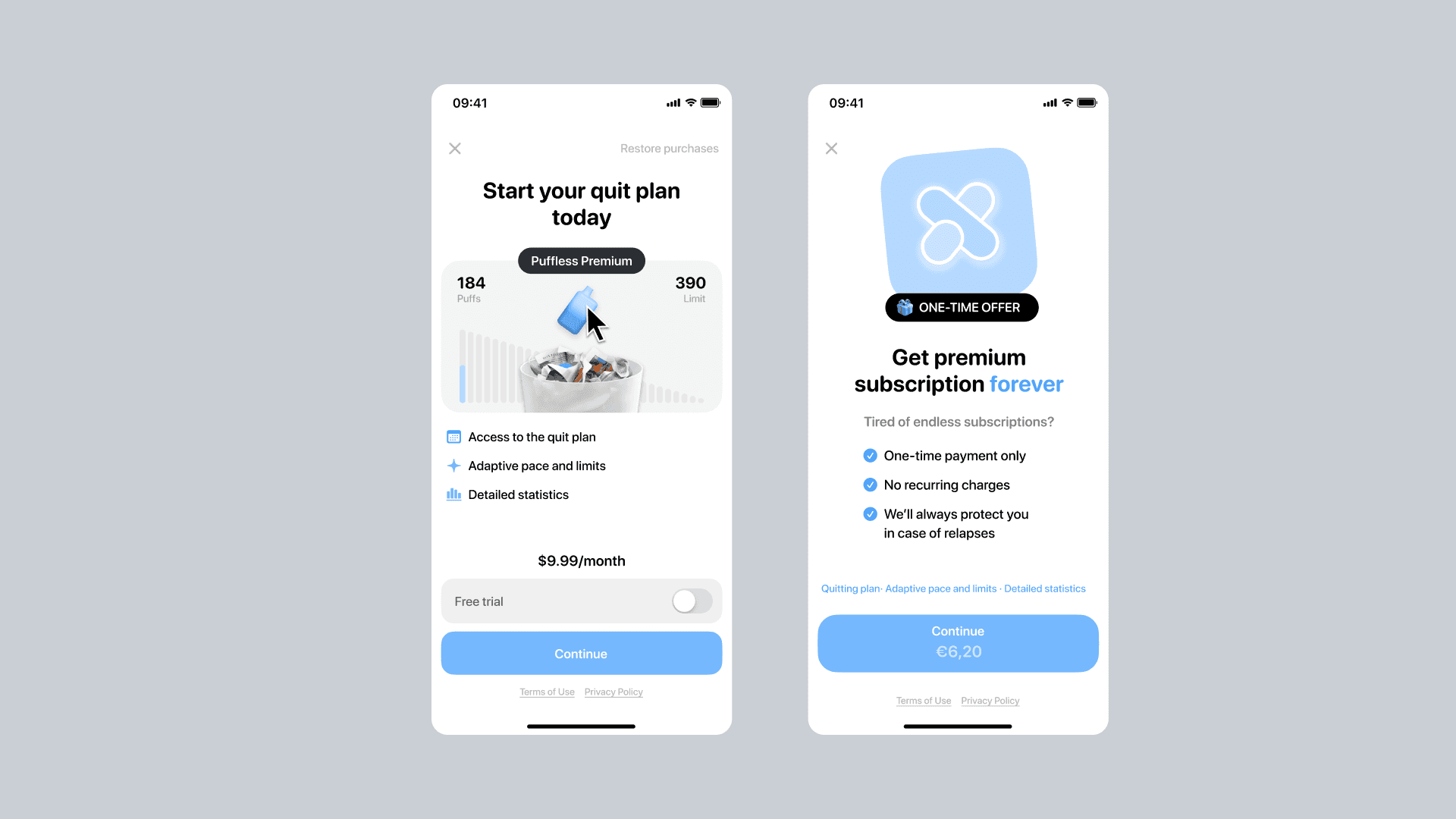 The main challenge was to stand out in a saturated market of smoking cessation apps by focusing specifically on the needs of vapers. Most existing solutions were either too clinical or relied on the «cold turkey» approach, which leads to high relapse rates. I needed to design an experience that made constant puff tracking feel like a natural part of the day rather than a chore, while also finding a way to significantly improve the app’s monetization without losing user trust.
