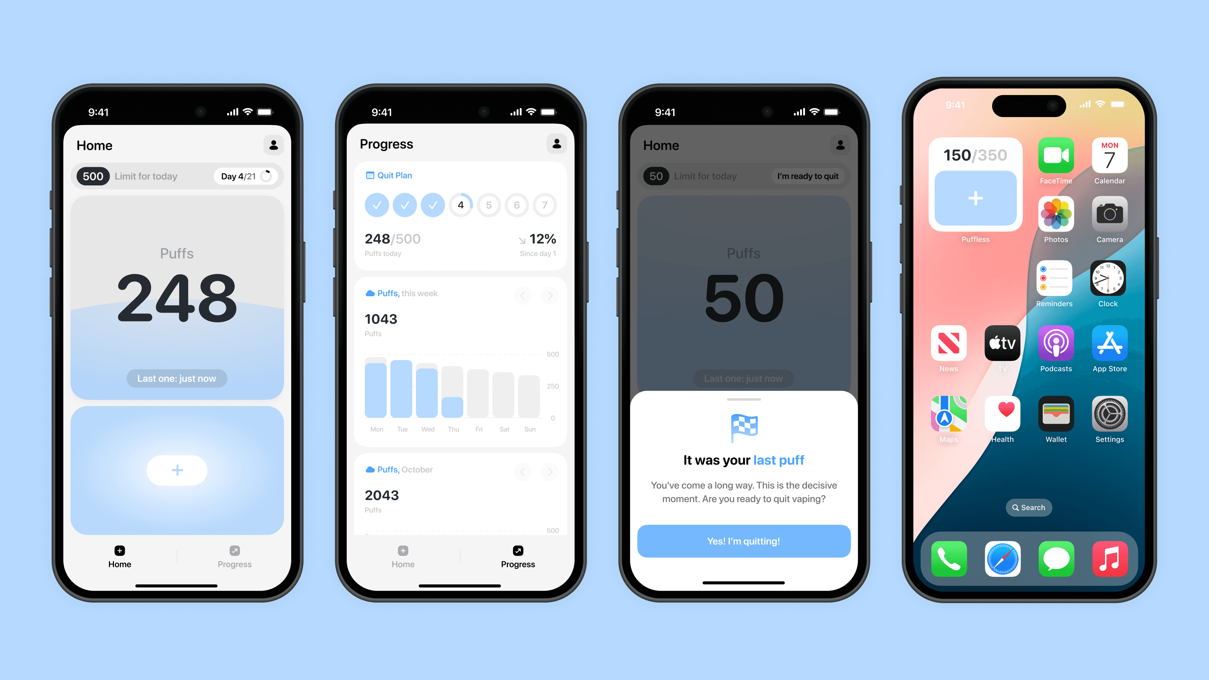 Puffless is an iOS app designed to help users quit vaping through a science-based «Gradual Method». Most apps on the market push users to quit cold turkey, which often leads to relapses. With Puffless, I wanted to create a tool that focuses on a slow, stress-free reduction of nicotine intake, making the process feel manageable and transparent.